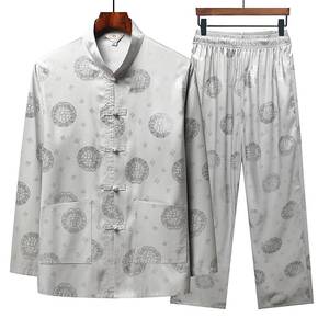 春秋季中老年男薄款长袖衬衫印花加大码宽松全丝绸爸爸...