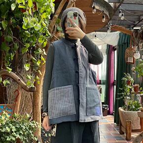 2020冬款落古泥复古文艺纯亚麻拼布宽松棉马夹坎肩...