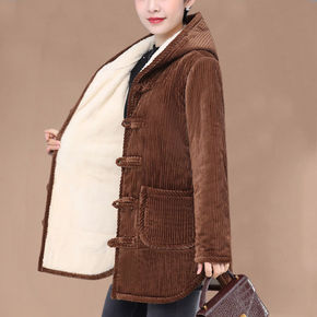 小个子妈妈冬装灯芯绒棉衣外套女中长款加绒棉服中老年...