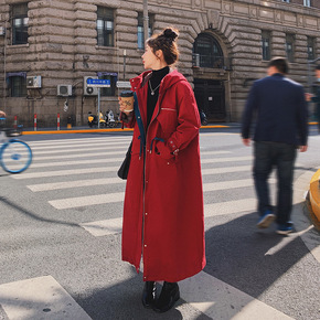 实拍2021冬季红色派克服女中长款韩版宽松过膝加绒...