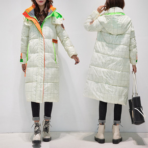 棉服女中长款宽松2021新款学生连帽过膝棉衣撞色冬...