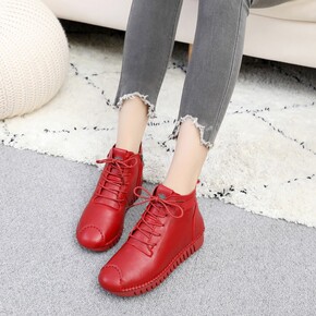 平底棉鞋系带软底女鞋马丁靴秋冬加绒中年女士红色鞋高...