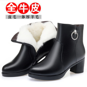 冬真皮中年妈妈棉鞋羊毛短靴高跟女式皮靴粗跟加绒棉皮...