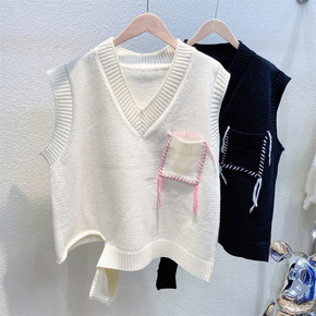 古着针织马甲女秋冬ins宽松短款V领配衬衫毛衣背心...