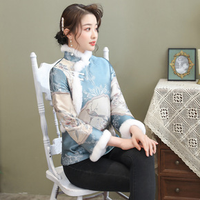 2022织锦提花蓝色民族风兔毛修身气质短款百搭棉衣...