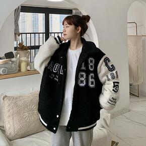 2021冬季新款颗粒羊羔毛羊剪绒棉服加厚保暖字母棒...