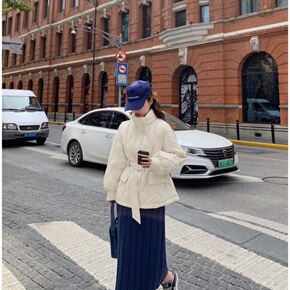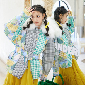国内鸟家2021冬款立领收腰亮面花朵绗线短款羽绒服...