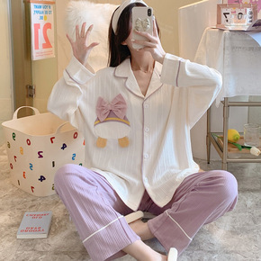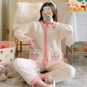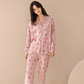睡衣秋冬女开衫长袖纯棉可爱甜美舒适柔棉翻领家居服套...