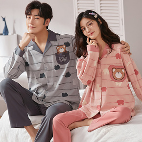 春秋季情侣睡衣长袖开衫宽松加大可爱甜美女士家居服休...