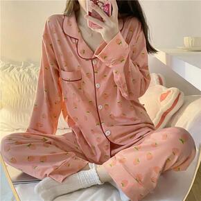 2021新款睡衣女精梳纯棉开衫长袖气质翻领甜美可爱...