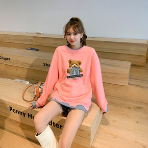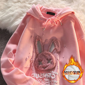 日系粉色卫衣女潮ins加绒加厚秋小个子设计感小众可...