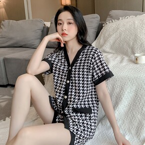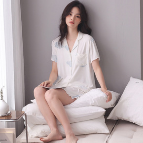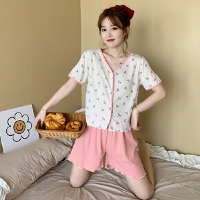 睡衣女夏季短袖家居服开衫V领两件套小香风可爱卡通甜...