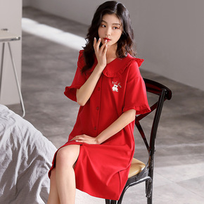 彩妮情新婚大红色甜美睡衣女夏季薄款紧赛纯棉短袖开衫...