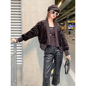 针织领拼接金丝绒夹棉薄棉服女2021初冬新款百搭显...