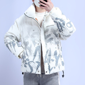 短款连帽男士羽绒服渐变水墨字母印花潮牌羽绒服外套男...