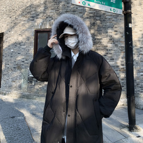 港风男装2021冬季中长款连帽羽绒服男大毛领宽松加...