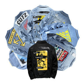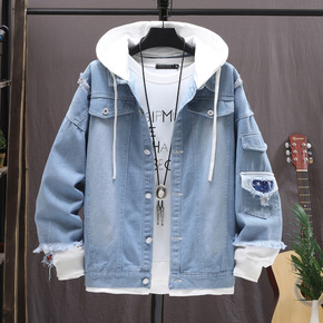 秋季新款外套时尚宽松男士潮连帽夹克牛仔衣青少年拼接...