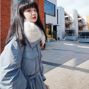 实拍chic浅蓝色过膝长款翻领大毛领插肩袖收腰系带...