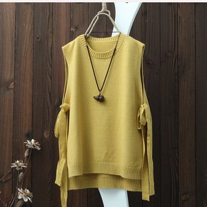 古咖春款文艺圆领套头无袖针织衫马甲背心女宽松两侧开...