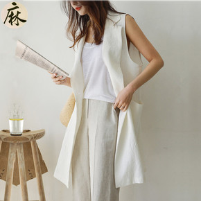 春夏无袖西装马夹单排扣宽松简约背心外套白色马甲亚麻...