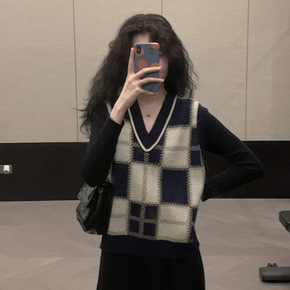 复古格子针织马甲女秋冬外穿叠穿V领毛衣背心2021...