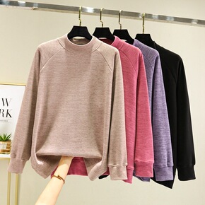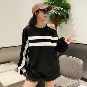 新款秋冬圆领露肩性感长袖韩版宽松T恤条纹大码卫衣原...