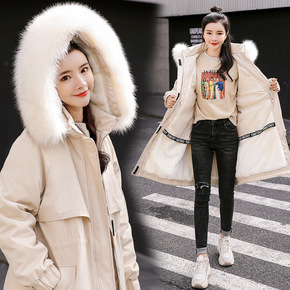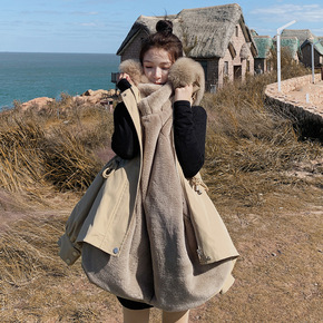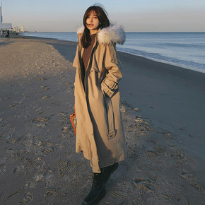 实拍ins工装风卡其色大毛领连帽仿兔毛内里收腰长款...