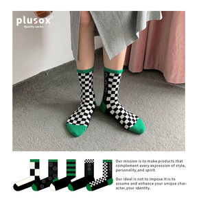 plusox 棋盘格袜子女秋冬ins潮春秋中筒袜潮...