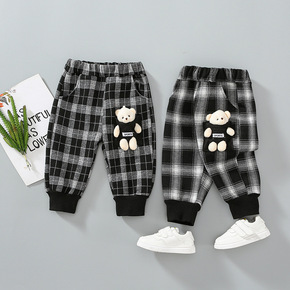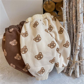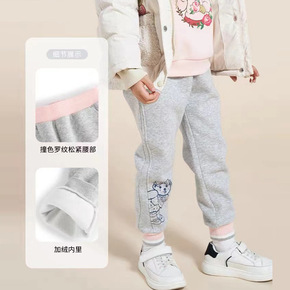 冬季加绒女童刺绣高腰卡通小熊束脚长裤韩版拼接裤子撞...