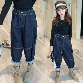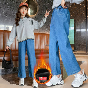 女童牛仔阔腿裤加绒加厚冬款儿童装套装秋冬装长裤子中...