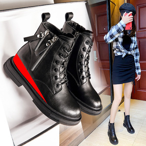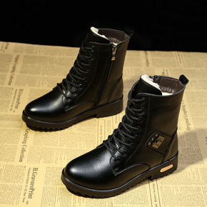 真皮马丁靴女2021秋冬季新款平底粗跟英伦风加绒秀...