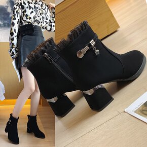 皮靴女2021秋冬新款欧美风尖头后拉链高跟短靴粗跟...
