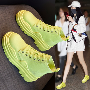 高帮帆布鞋女2021秋冬季新款薄款透气厚底松糕鞋休...