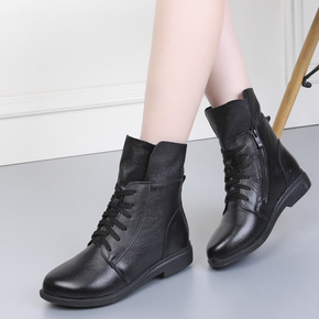 新款短靴女头层牛皮加绒保暖系带中筒英伦风韩版时尚马...