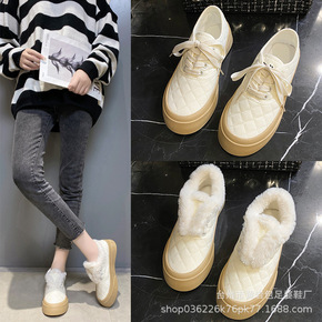 厚底纯色加绒板鞋女2021秋冬季复古菱格韩版棉鞋学...