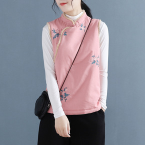 文艺纯色羊羔绒包边立领斜襟盘扣棉麻绣花马夹女冬复古...