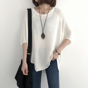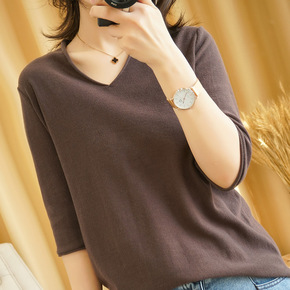21新款棉麻针织短袖v领T恤女纯色宽松显瘦纯棉大码...