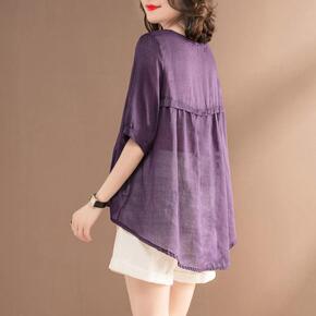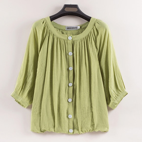 棉麻文艺衬衫女圆领套头纯色五分袖韩版衬衣女显瘦遮肚...