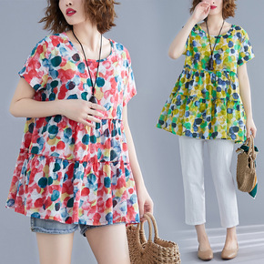 夏新款文艺彩色波点印花拼接棉麻短袖娃娃衫气质减龄高...