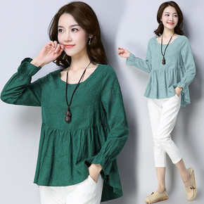秋款棉麻上衣宽松大码长袖提花娃娃衫喇叭袖亚麻棉T恤...