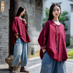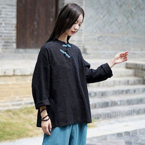 21新品棉麻女装复古宽松大码拼色盘扣亚麻上衣衬衫女...