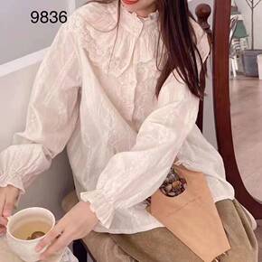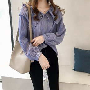 2021春新款娃娃领系带衬衫长袖上衣个性棉麻学生T...