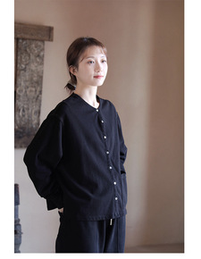 四季款黑色棉亚麻针织布圆领开襟纽扣宽松小开衫衬衫7...