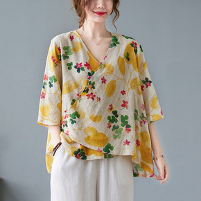 2021夏新款复古文艺V领大码胖mm棉麻印花盘口五...