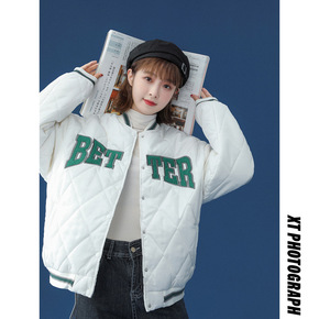 2021秋冬新款韩版宽松百搭简约菱形格棒球领羽绒服...