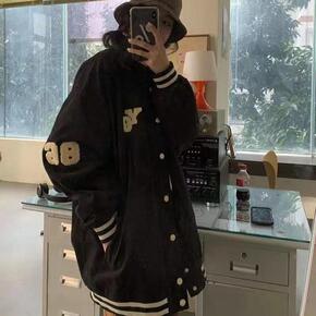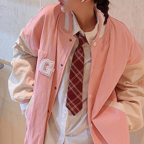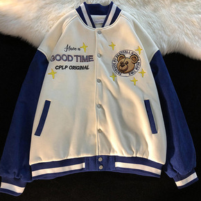 棉质韩版拼接立领刺绣小熊情侣棒球服秋季新款宽松显瘦...