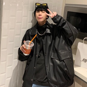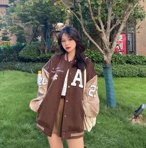 明星同款杨幂刺绣磨毛PU拼接夹克宽松休闲复古美式棒...