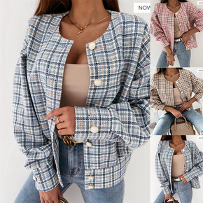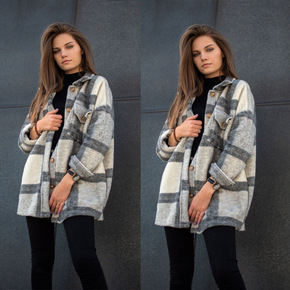 跨境外贸独立站2020秋冬季欧美长袖翻领宽松格子女...