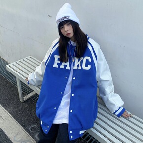 美式街头复古贴补字母克莱因蓝拼皮袖宽松棒球服男女夹...