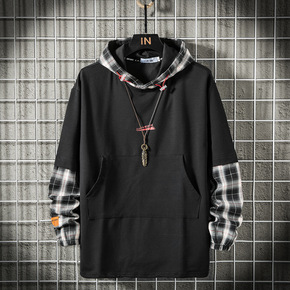 情侣装棒球衣格子连帽衫拼接假两件男士卫衣外套男装棒...